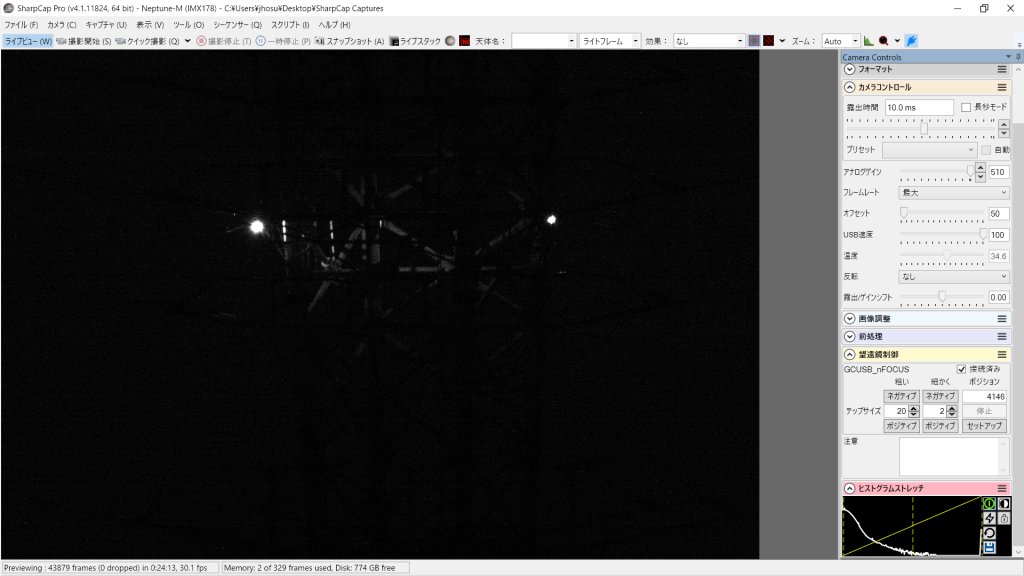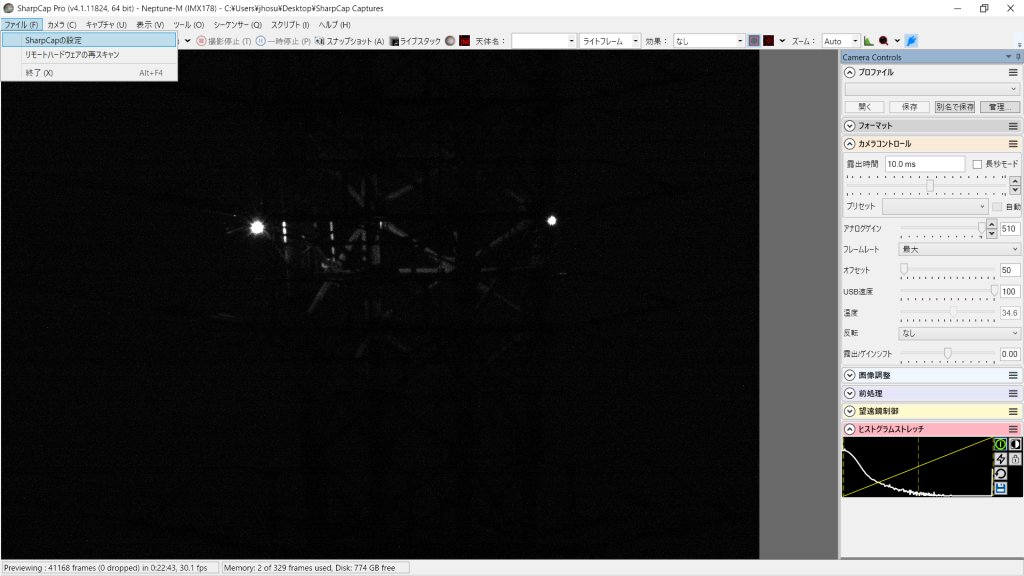 カメラも接続して、SharpCapを立ち上げます。